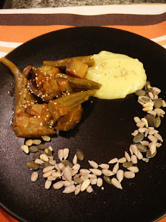 Faz-se um refogado com a cebola, e adiciona-se a beringela cortada aos bocados, e os quiabos inteiros (eu retiro as partes de cima e de baixo dos quiabos), seguido do tomate e de água até cobrir os vegetais. Depois é só deixar cozer em lume brando (como eu gosto bem cozidos deixei cozer 20 minutos).